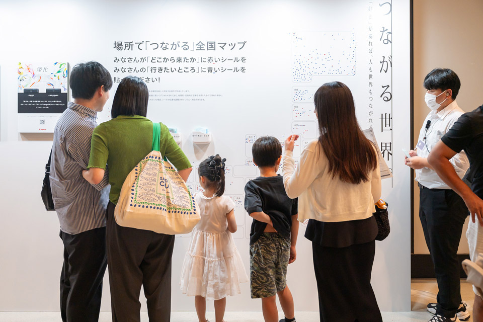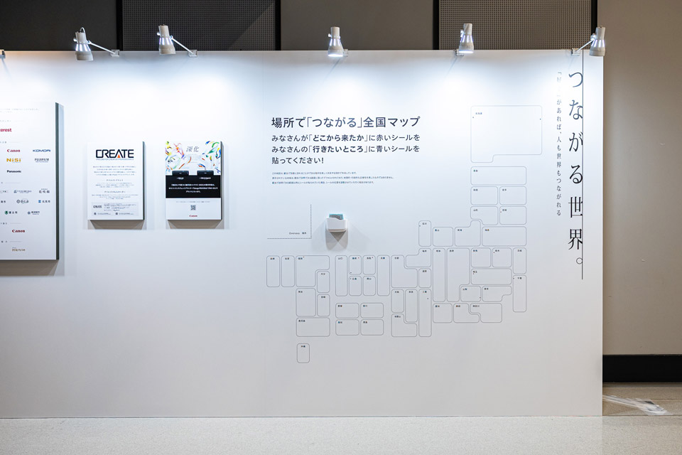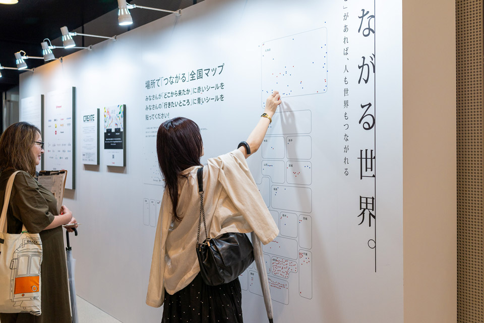 人通りの多いホールAの入口に大きな全国地図を設置し、「どこから来たか」「次どこに行きたいか」をシールで貼れるようにしました。シールの数や位置を見て会話がはずんだり、様々な地域に思いを馳せる機会となるほか、会場にいる他人同士の緩いつながりも感じられる場となりました。
