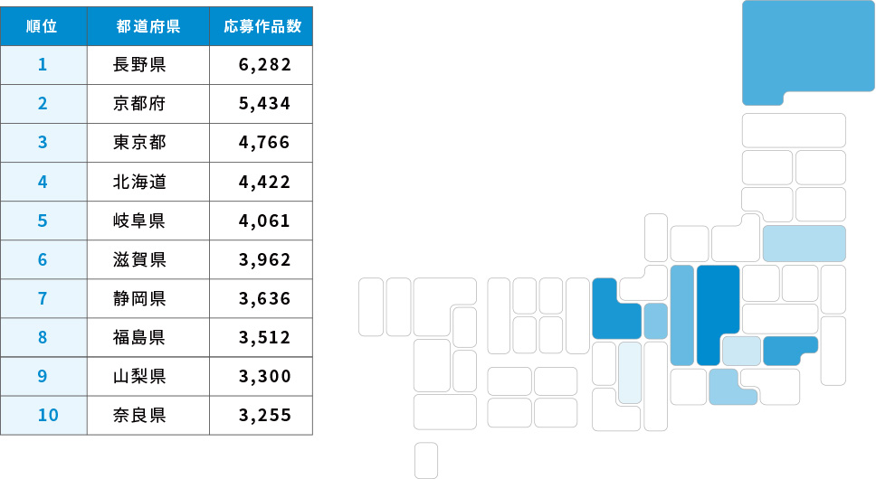 日本全国名勝地の四季写真を募集するフォトコンテスト「日本写真100景」フォトコンテスト2020、2021、2022、2023、2024に応募された作品から、海外分を除いた延べ100,000作品の都道府県別応募数