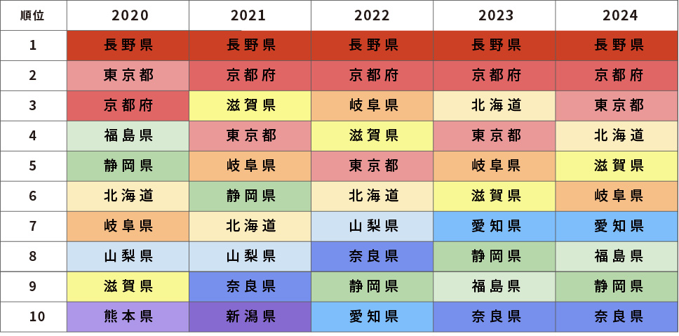 1位:長野県、2位:京都府、3位:東京都、4位:北海道、5位:岐阜県
