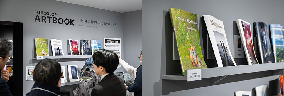 また、富士フイルムブース内のプロラボ「クリエイト」エリアでは、自身の写真をクリエイティブなデザインにまとめられるサービス「ARTBOOK」の展示が行われ、作例としてFUJIFILM10選の方々の作品が展示されました。