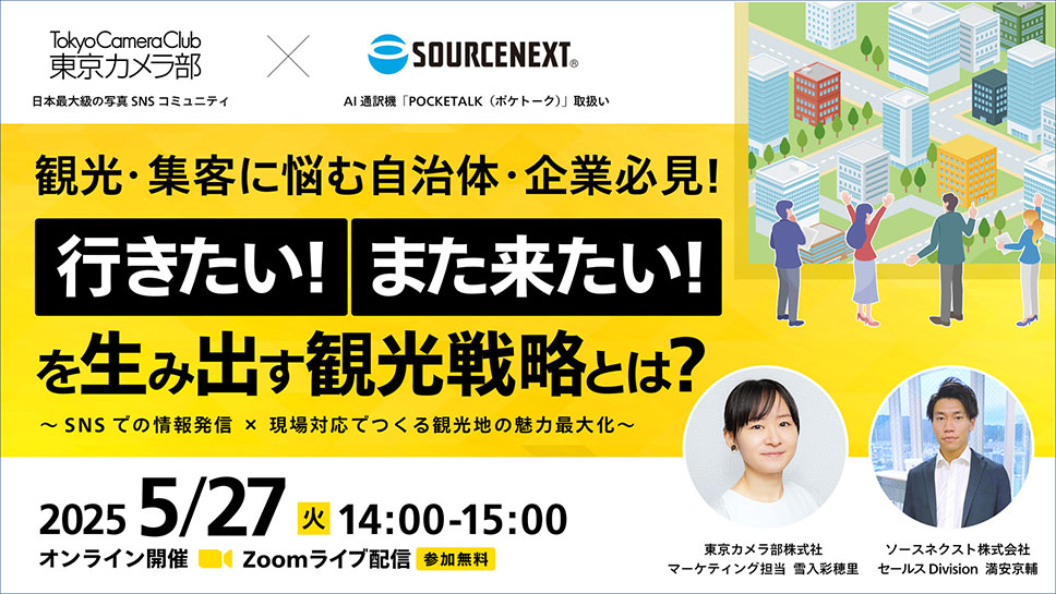 東京カメラ部株はこの度、『観光・集客に悩む自治体・企業必見!「行きたい!また来たい!」を生み出す観光戦略とは?』と題したオンラインセミナーを、AI通訳機「POCKETALK(ポケトーク)」を取り扱うソースネクスト株式会社と共同開催します。