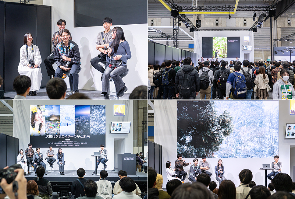 ニコンブース最大のメインステージ「Nステージ」にて開催。歴代のU-22受賞者の中から5名のクリエイターが登壇し、ポートレート、自然風景、都市風景、日本文化など撮影対象やスタイルがバラバラの5名が、自身の撮影の原点とこれからのビジョンなどをそれぞれ語りました。