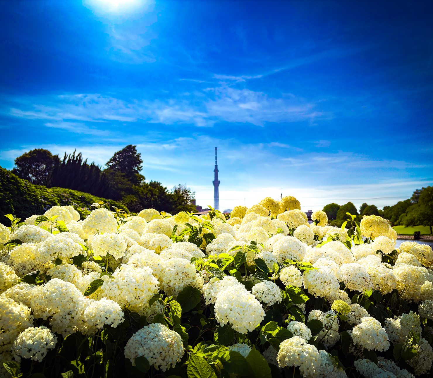 一面に咲き誇る白いアジサイを低い位置から捉え、夏の空へと視線が抜けていく構図を意識しました。雲の流れと光の強さを活かし、奥に立つ東京スカイツリーがさりげなく都市の気配を添えています。自然の柔らかさと東京らしい風景が同時に感じられる一瞬を切り取った一枚です。