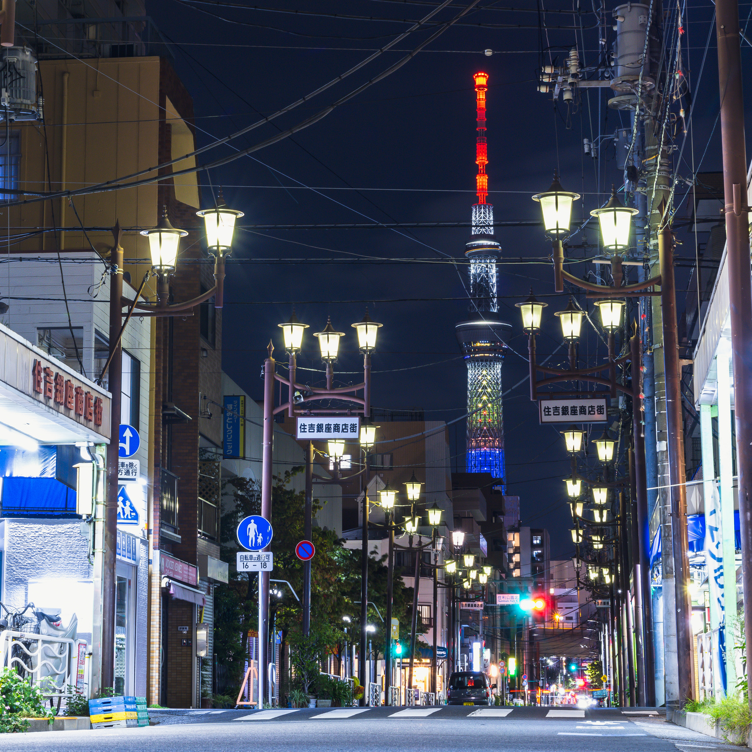 住吉銀座商店街の街灯がつくる光のライン。その先にそびえる東京スカイツリー。昔ながらの商店街の灯りと、都会の象徴である東京スカイツリー。地域に根ざした商店街と世界に誇るランドマークが共存する、江東区ならではの風景です。