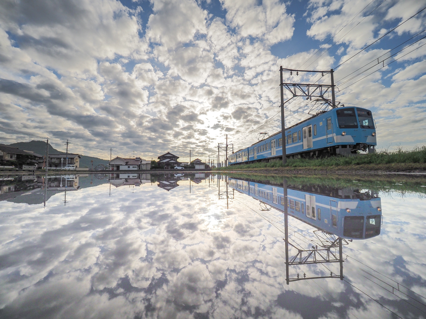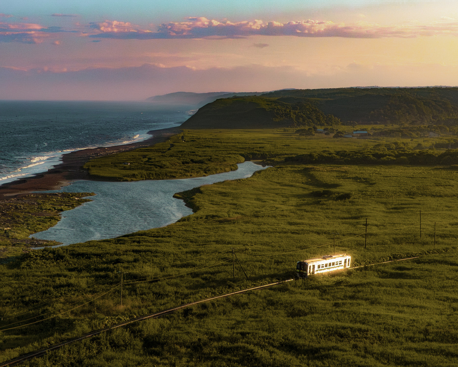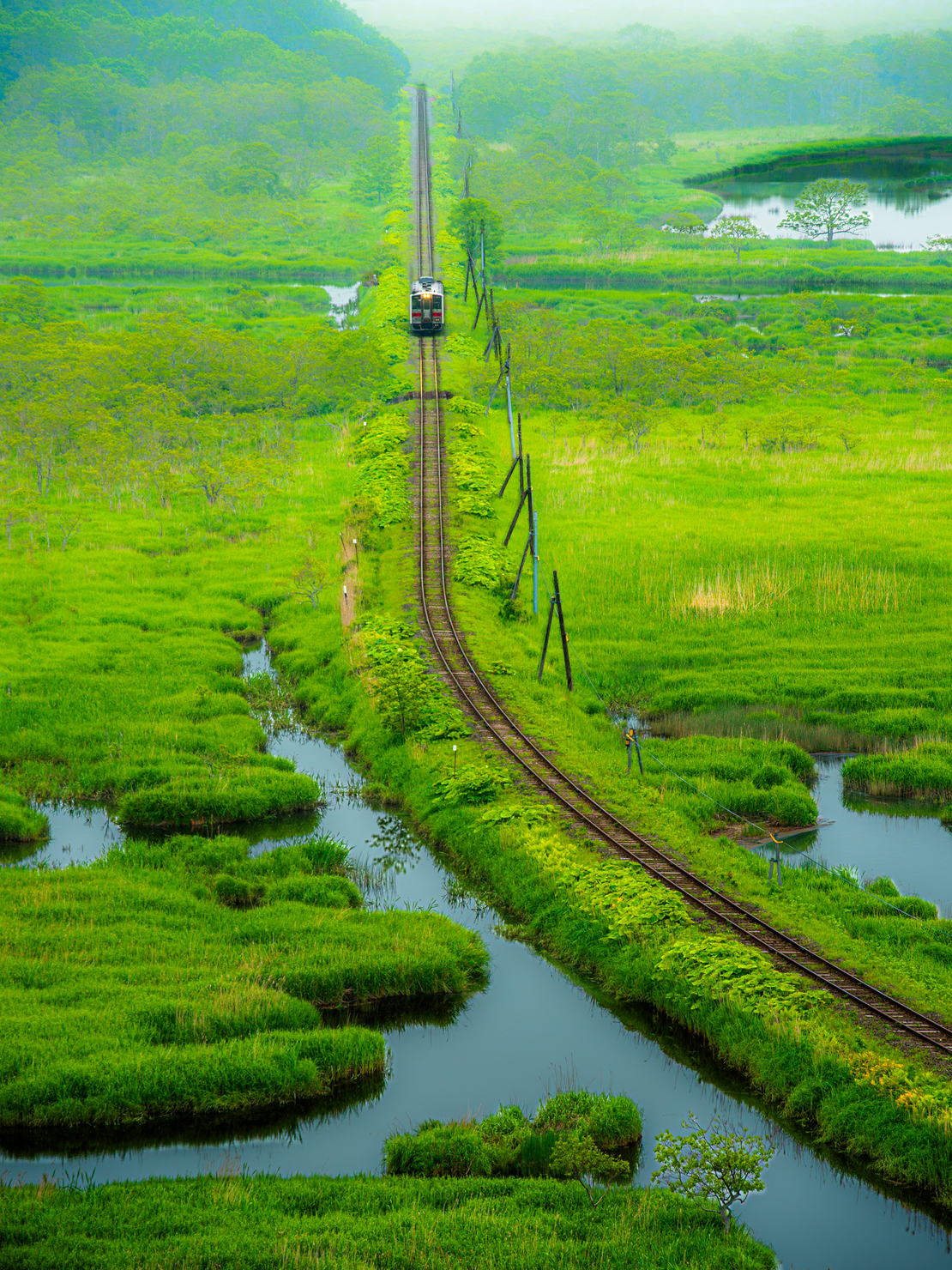 夏の湿原と霧の上を、単行列車が細い築堤を通って進む。人口減少が進む地方では、こうしたローカル線の未来が危ぶまれている。この路線も、いつか静かに途絶えてしまうかもしれない。だからこそ、私は柔らかな光と列車が画面に入る瞬間を待ち、この景色が“なぜ大切なのか”という想いごと写し留めたいと思った。