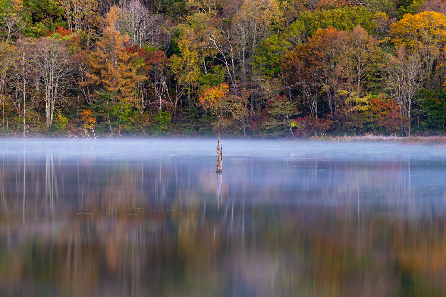夜の冷気と朝の光がせめぎ合う瞬間、鏡池から立ち上がる毛嵐が、静かに森を包み込みました。音のない世界の中で、水と木々が呼応するように息づくその光景に、戸隠が古くから神域と呼ばれてきた理由を感じました。自然そのものが目覚める、わずかな時間を写し留めた作品です。