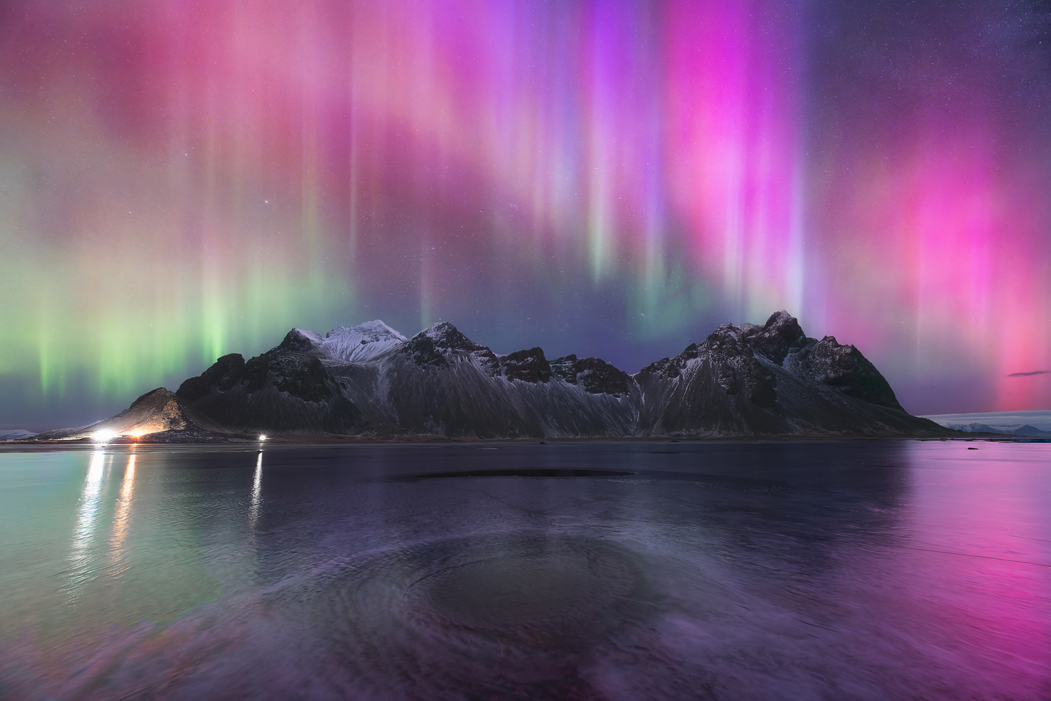 太陽活動は11年周期で極大を迎えます。その極大期に起きたオーロラの大爆発。その時私はアイスランドという、オーロラの中心地にいました。通常、オーロラは緑色ですが、より強いオーロラが出るとその色はピンクや赤色になります。この日は、そんな赤いオーロラが日没してから日が昇るまでずっと出続けていました。