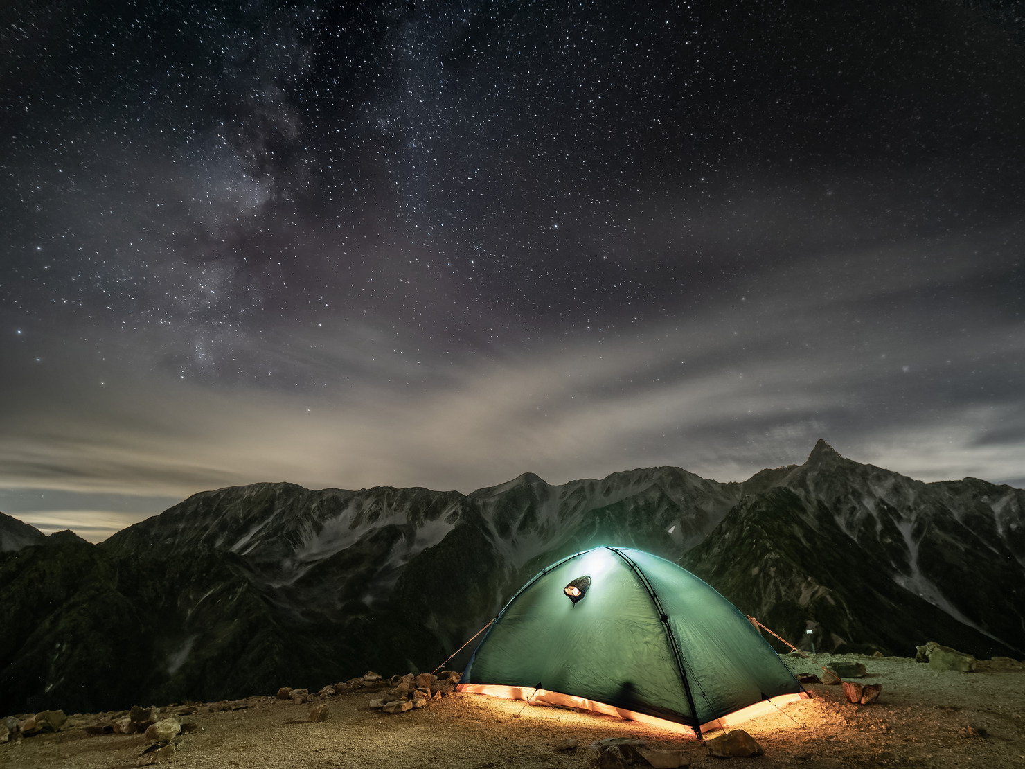 北アルプス、西岳には槍ヶ岳を望むことができる最高のテント場がある。ここを目的地とする登山者は少ないが、天の川が雲に飲まれながら稜線に沈んでいく姿を撮りながら、ここまで登ってよかったと思った。撮影のためにテントの灯りを点けたまま就寝してくれた友人に感謝する。