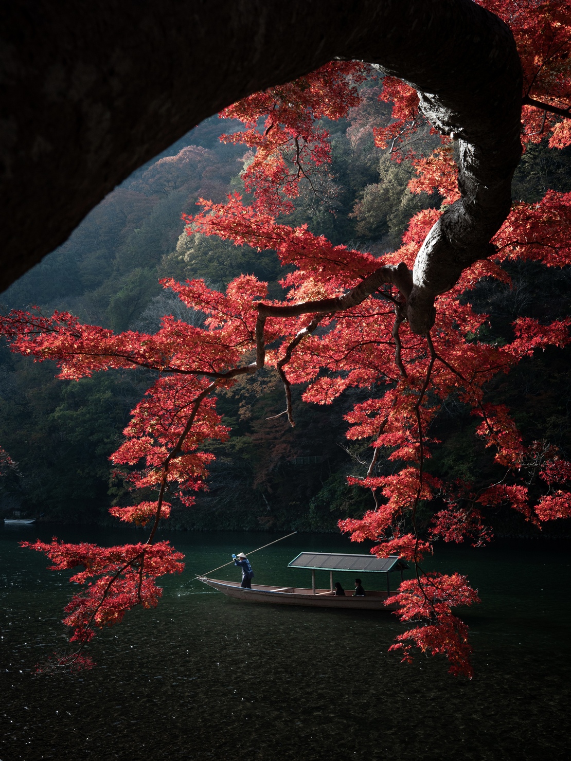この写真は、いくつもの偶然が重なり合った一瞬を捉えたものです。柔らかな朝陽が差し込む中、深紅に染まった紅葉の間を、笠を被った船頭が静かに舟を進めていきました。何度も行き交う屋形船の中で、ただ一度だけ訪れたこの情景に、秋の深まりを感じました。