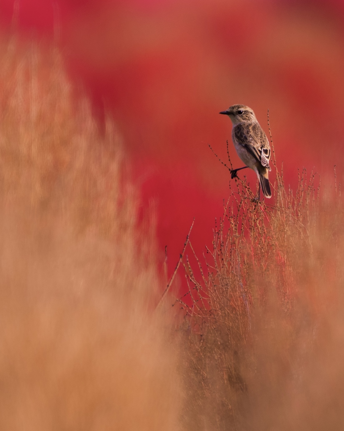 一面に広がるコキアの中、ノビタキ達がコキアに乗ってくれるのをひたすら待ちました。綺麗に紅葉したコキアに来てくれと祈りながら、あまり乗り心地が良くないのか、すぐに飛んでいってしまいます。その中でなんとか撮れた一枚です。