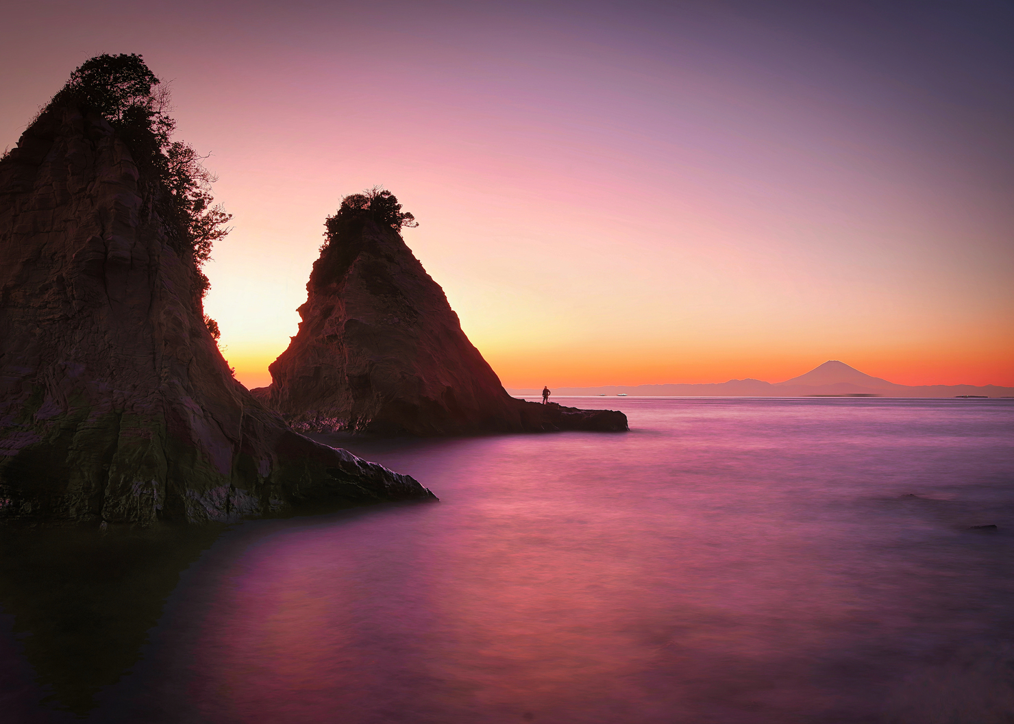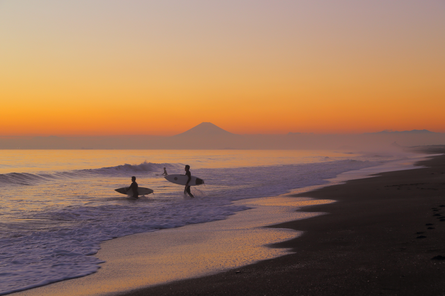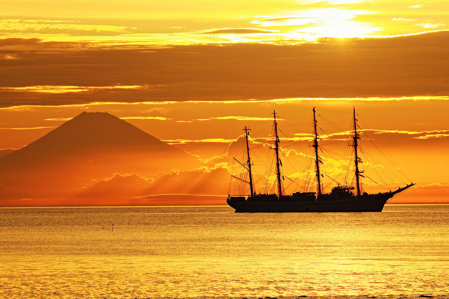 大きな富士山を背景に、琥珀色に輝く夕陽が館山湾に降り注ぎ、その中を優雅に進む帆船のシルエットが美しく映える絶妙なタイミングを捉えた作品です。