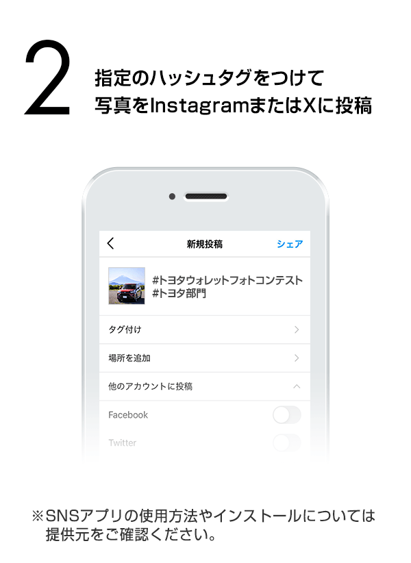 募集期間内に、指定のハッシュタグをつけて写真をInstagram、またはXに投稿